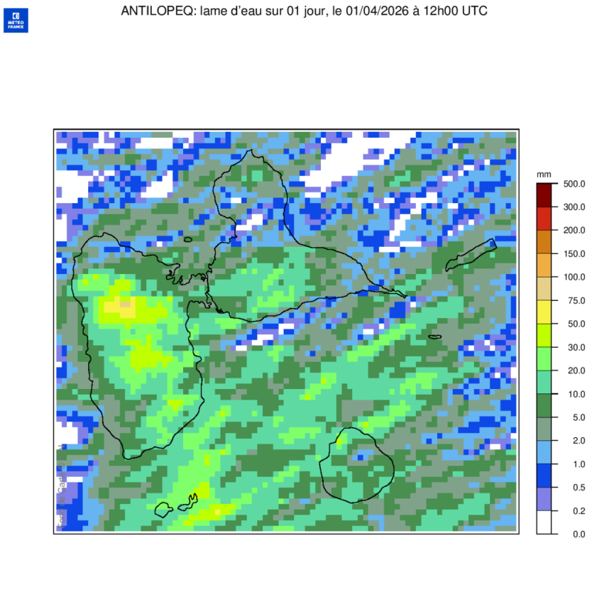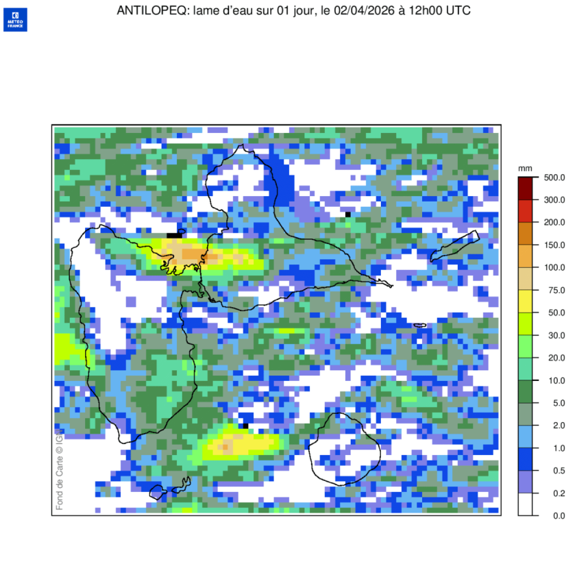 L’épisode pluvieux le plus intense de la semaine se produit jeudi 2 avril entre 10 h et 18 h. Des averses intenses s’abattent sur les Grands-Fonds de Morne à L’eau et dans le Grand Cul-de-Sac. Les cumuls de pluie