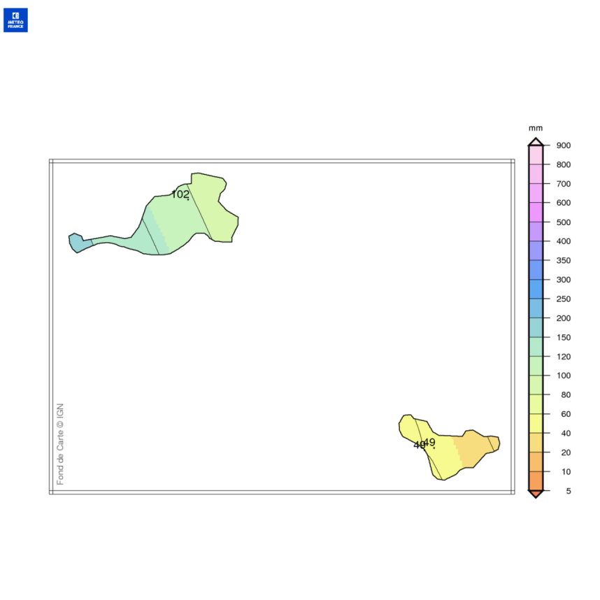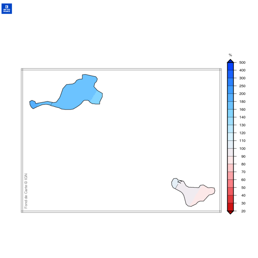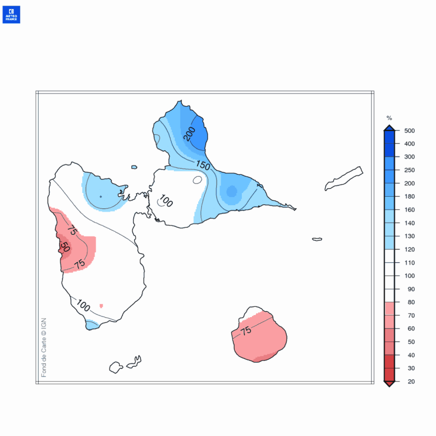 A contrario, Saint-Martin et le Nord-Est de la Grande-Terre connaissent localement de fort excédent (+50 à +200).