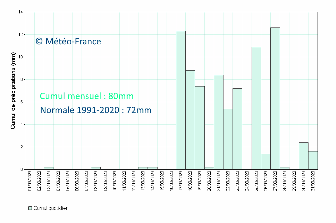Mars 2023 est au final assez classique à localement humide, comparé au 70 mois de mars précédents.