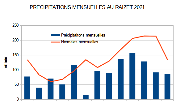 Elle totalise 2557 h 38 min, soit un excédent de 7.3% à la station du Raizet. La répartition est assez homogène avec un peu plus de 10h de soleil par mois par rapport aux normales (1991-2010); seuls les mois d’avril et de juin sont déficitaires. Le mois de mai se démarque en affichant 40 h 30 min, c’est à dire 20% de plus par rapport à la normale de ce mois.