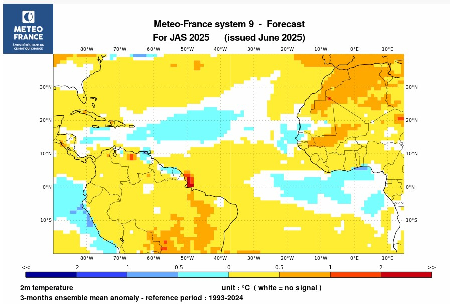 Pour les 3 mois à venir, l'océan Atlantique tropical continue à se refroidir lentement par l'est. La tendance est au retour progressif de températures de surface plus ou moins homogènes et de saison autour de l'arc antillais. Cette température de surface de l'océan autour des îles restant le moteur principal du temps qu'il y fera, elle est de moins en moins favorable au développement convectif et à un retour à des conditions neutres (climatologiquement normales).